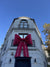 Clădirea întreagă a prins viață: mii de lumini care curg ca o ploaie de stele și funda gigant care transformă totul într-un cadou spectaculos al sărbătorilor.